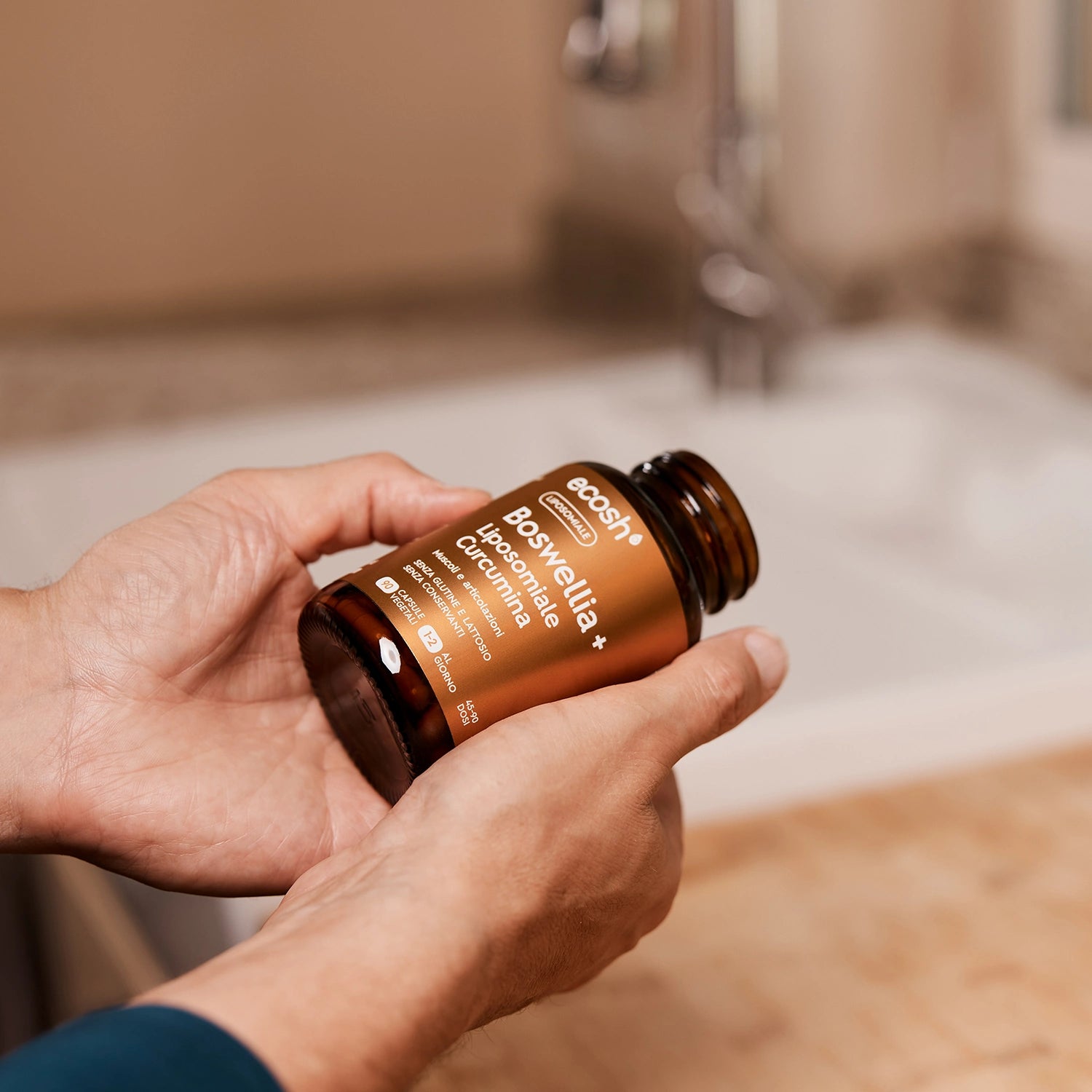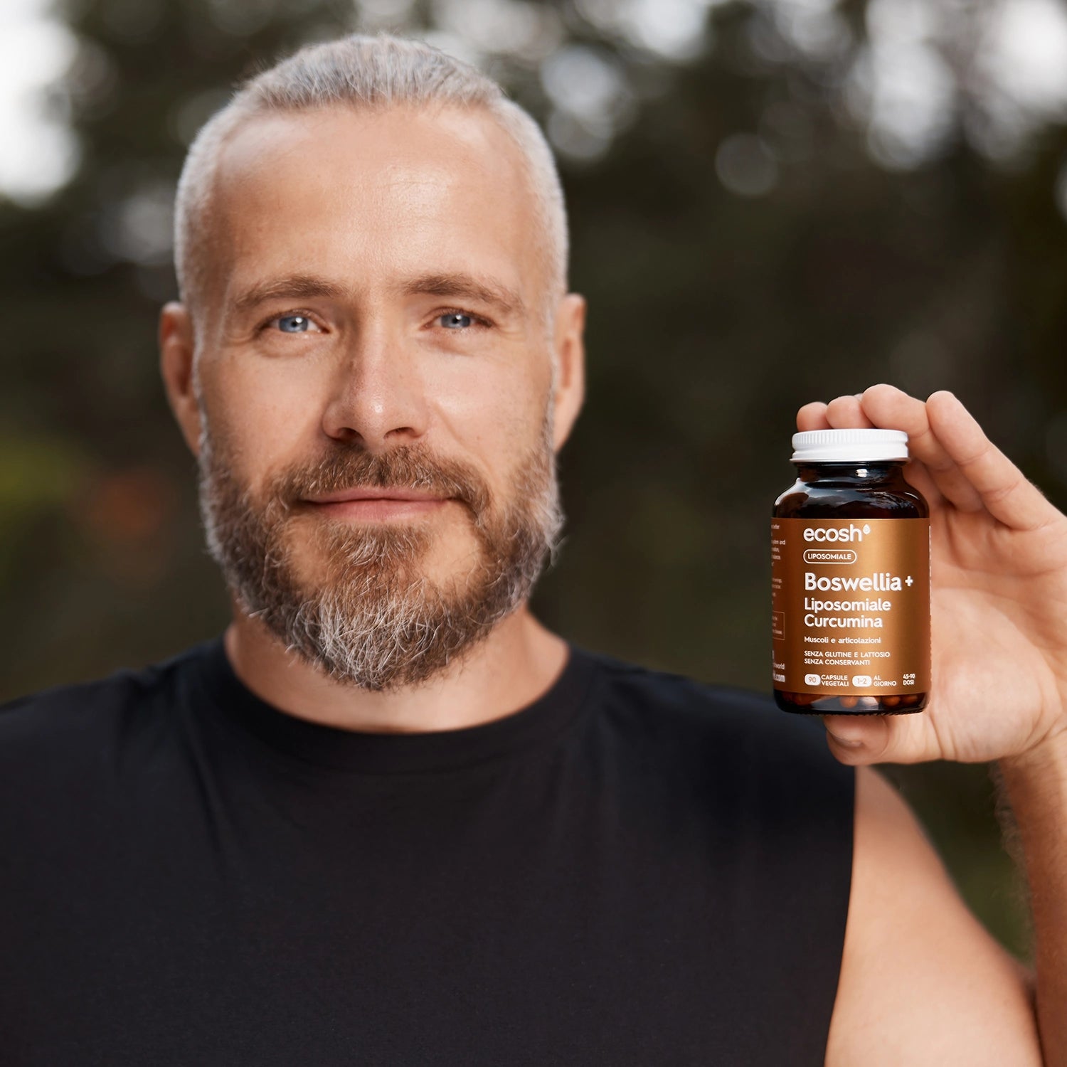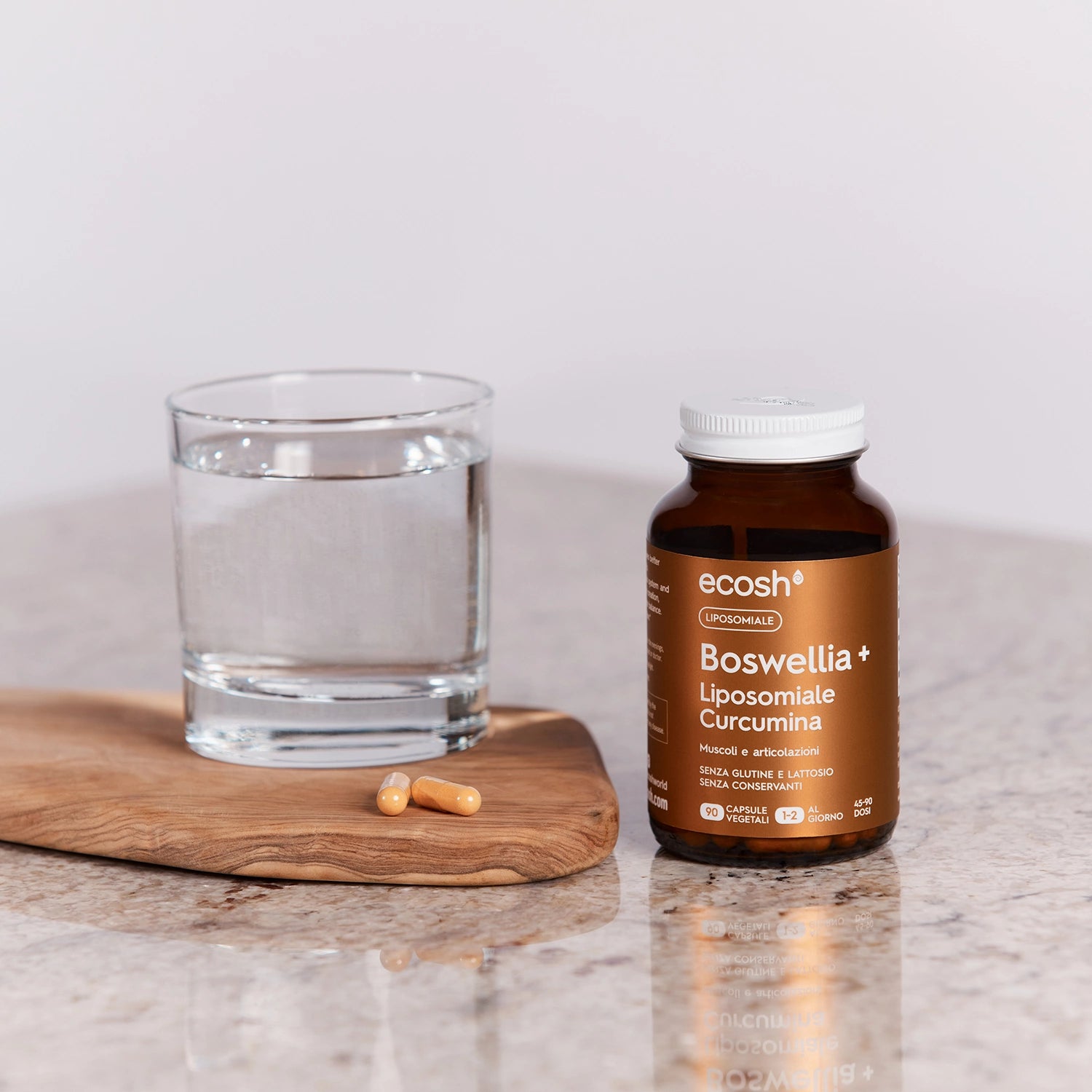 Estratto di Incenso Indiano (Boswellia Serrata) 6-10:1 (acidi di Boswellia min. 65%); complesso liposomiale della curcumina [maltodestrina, estratto di curcuma o radice gialla (Curcuma L.) (curcuminoidi min. 18%), umettante: glicerolo, emulsionante: fosfolipidi della lecitina di girasole]; agente di rivestimento: pullulan (involucro di capsula vegetale); agente antiagglomerante: sali di magnesio degli acidi grassi.