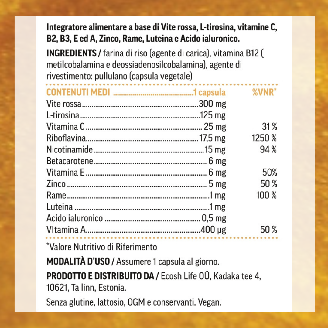 Vite rossa (Vitis vinifera L., semi) polvere; L-tirosina, agente di rivestimento: pullulano (capsula vegetale), Vitamina C (calcio L-ascorbato), Vitamina B2 (riboflavina-5′-fosfato), Vitamina B3 (nicotinamide), Betacarotene, Vitamina E (d-alfa tocoferil succinato), Zinco (zinco glicinato), Rame (rame gluconato), Luteina, Acido ialuronico, Vitamina A (retinile palmitato).